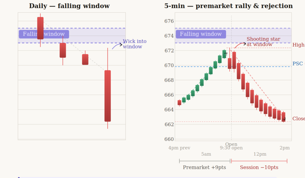The market validated my original bearish thesis all day. The daily window held as resistance exactly as I’d drawn it. The puts I’d planned to buy would have been winners. My analysis was right. My execution was rogue.